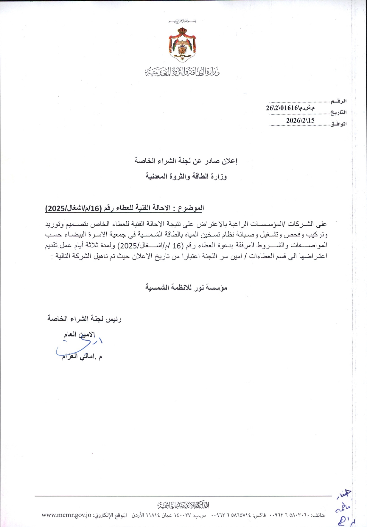 الإحالة المبدئية لعطاء رقم 16 م اشغال 2025