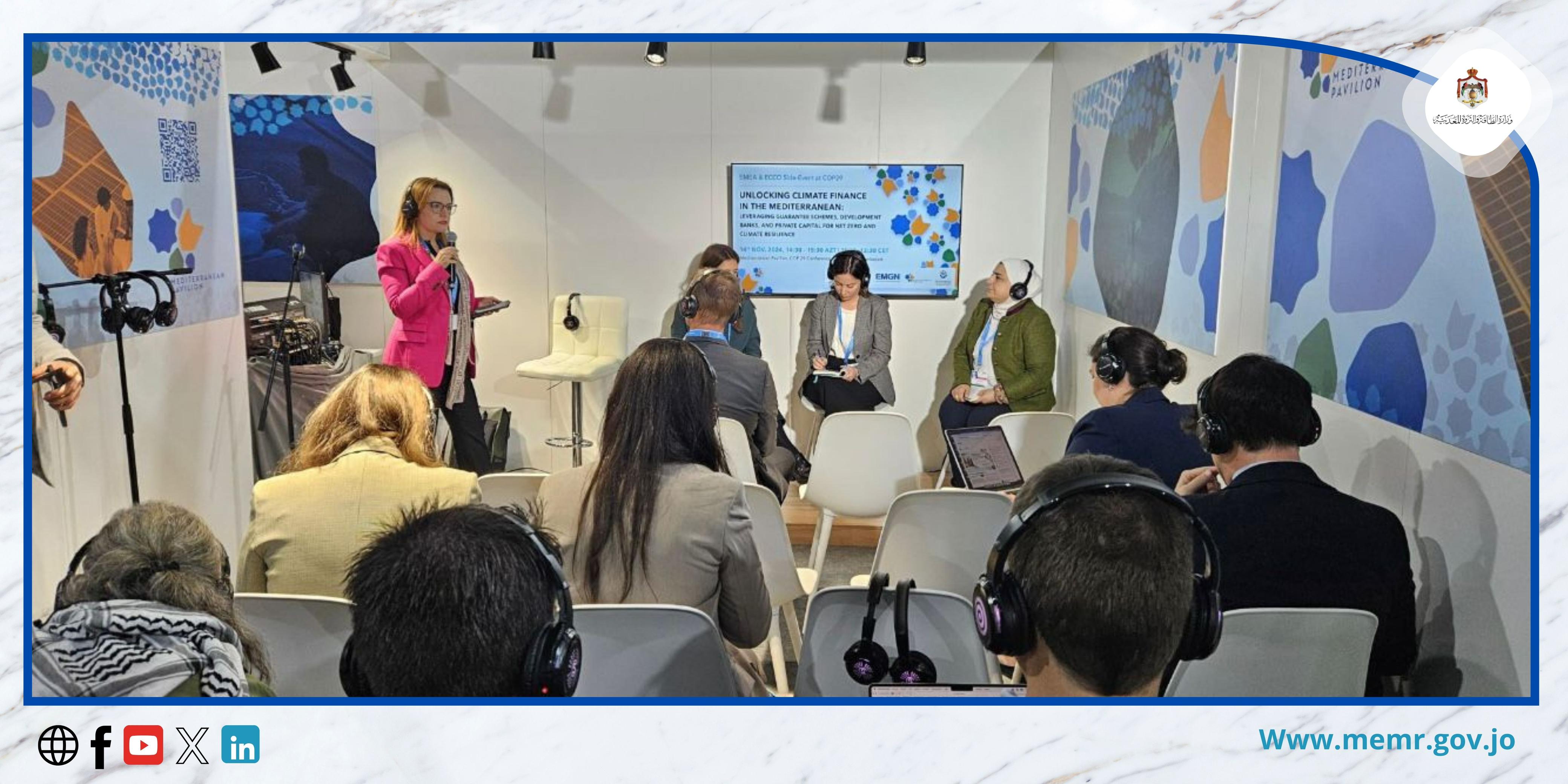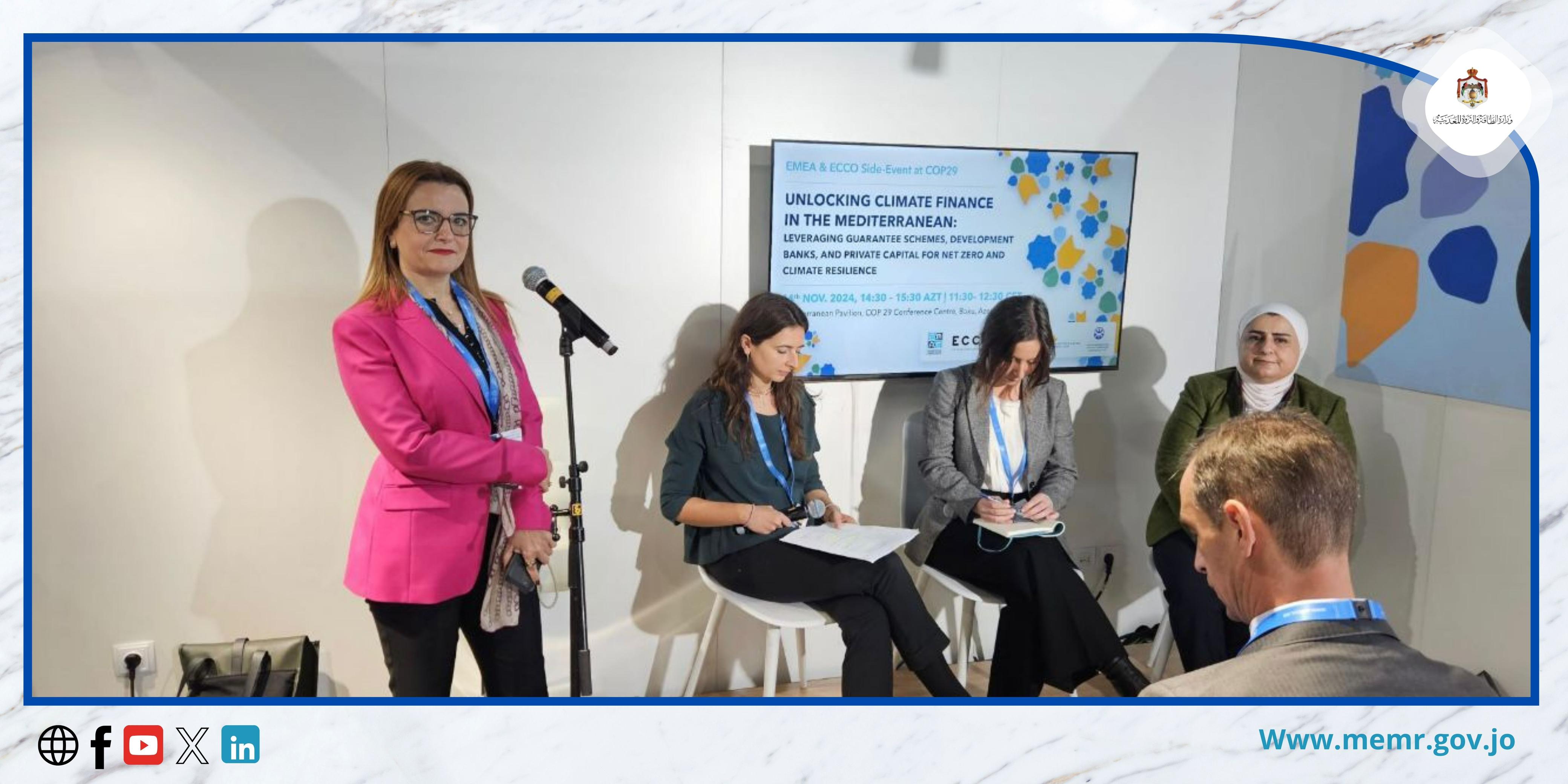 14 تشرين الثاني 2024- شاركت رئيس قسم تطوير المشاريع في صندوق الطاقة المتجددة التابع لوزارة الطاقة والثروة المعدنية المهندسة لينا مبيضين، في الجلسة الحوارية حول" إطلاق العنان للتمويل المناخي في منطقة البحر الأبيض المتوسط: الاستفادة من خطط الضمان وبنوك التنمية ورأس المال الخاص لتحقيق صافي انبعاثات صفرية ومرونة المناخ Unlocking Climate Finance in the Mediterranean: Leveraging Guarantee Schemes, Development Banks, and Private Capital for Net Zero and Climate Resilience " المنعقدة ضمن فعاليات مؤتمر الأمم المتحدة السنوي التاسع والعشرين المعني بتغير المناخ (COP29) المنعقد حاليا بمدينة باكو - أذربيجان خلال الفترة 11-22 تشرين الثاني الحالي.