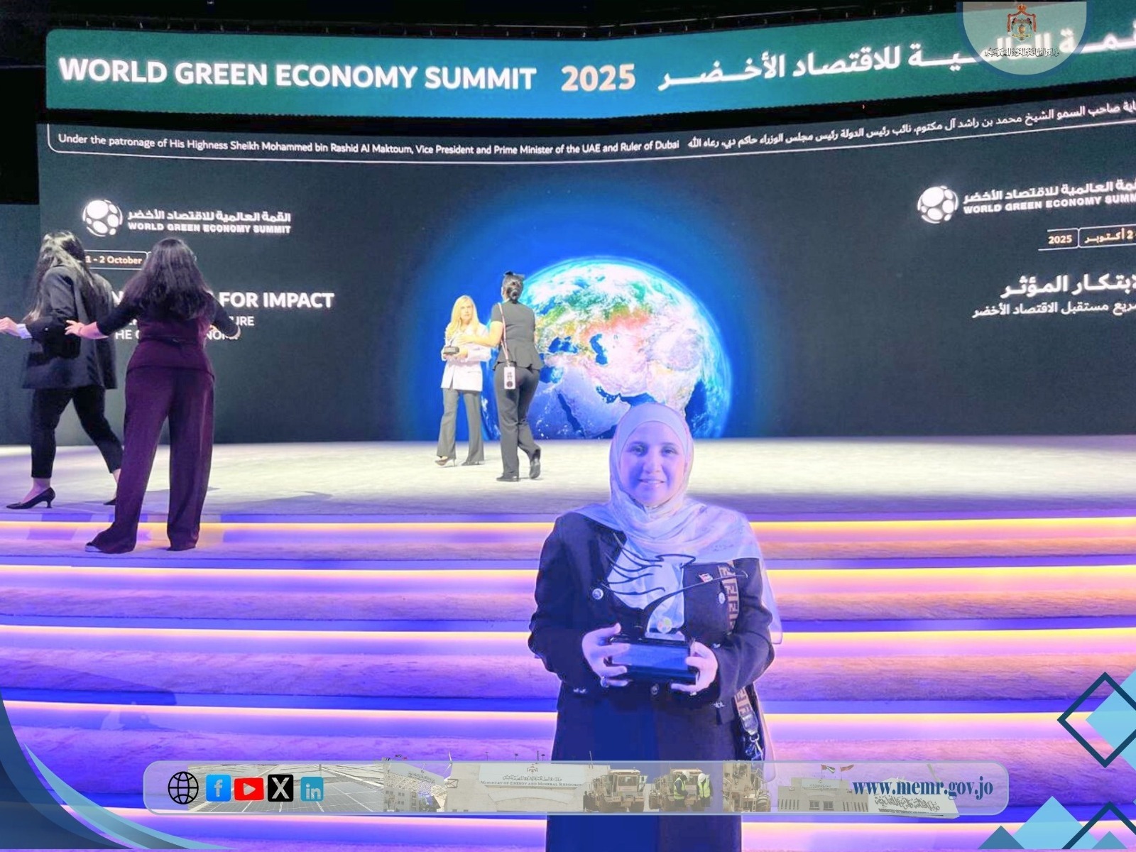 وجرى تسليم الجائزة اليوم الأربعاء، في مدينة دبي، ضمن فعاليات الدورة الحادية عشرة من القمة العالمية للاقتصاد الأخضر، التي تُعقد برعاية سمو الشيخ محمد بن راشد آل مكتوم، نائب رئيس دولة الإمارات رئيس مجلس الوزراء حاكم دبي، خلال يومي 1 و2 تشرين الأول الجاري.