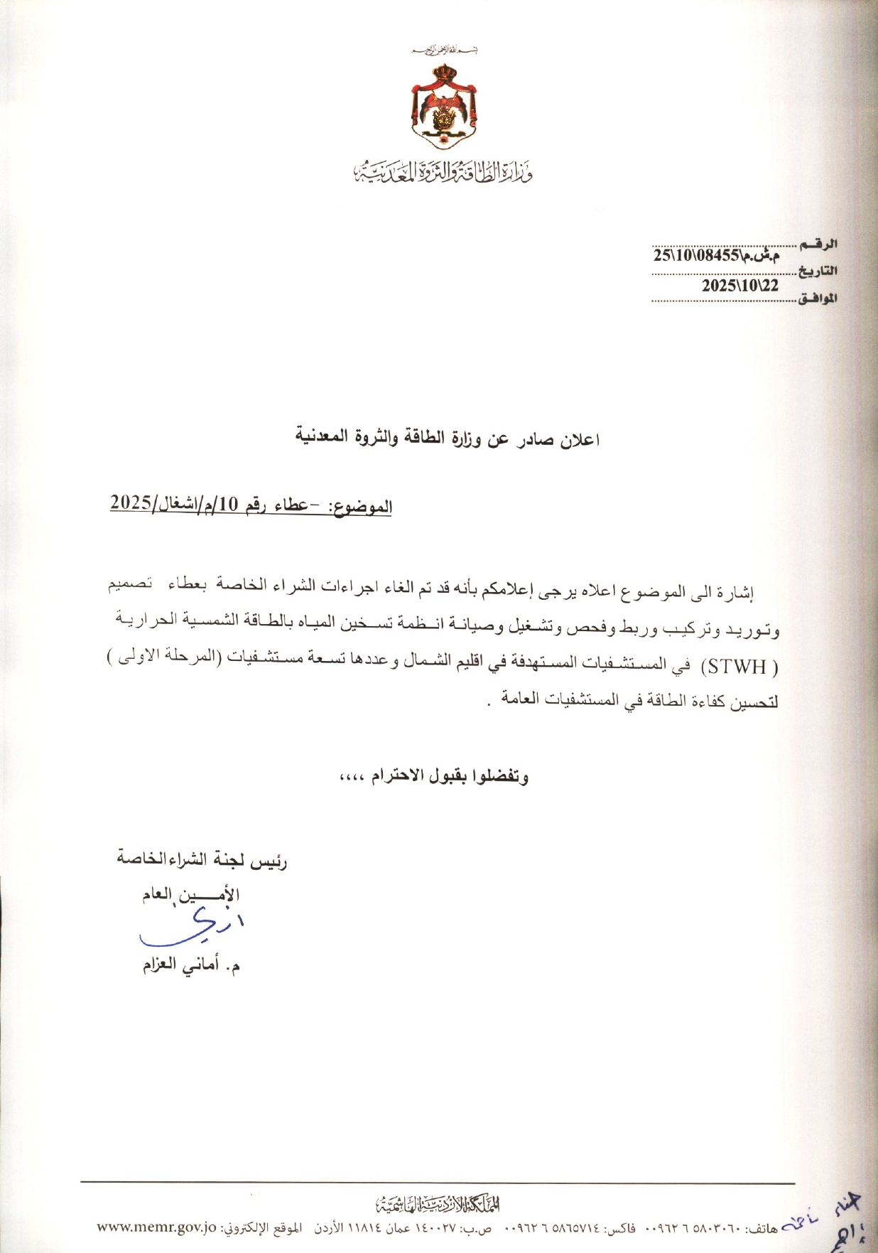إعلان إلغاء العطاء رقم 10/م/أشغال /2025