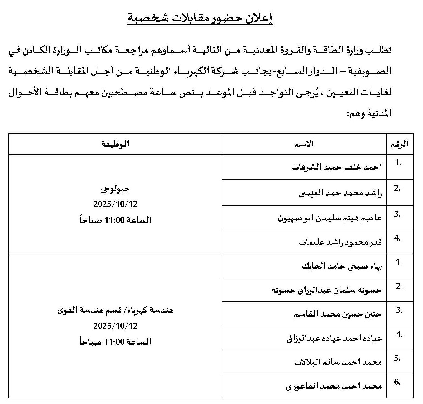 إعلان حضور مقابلات شخصية