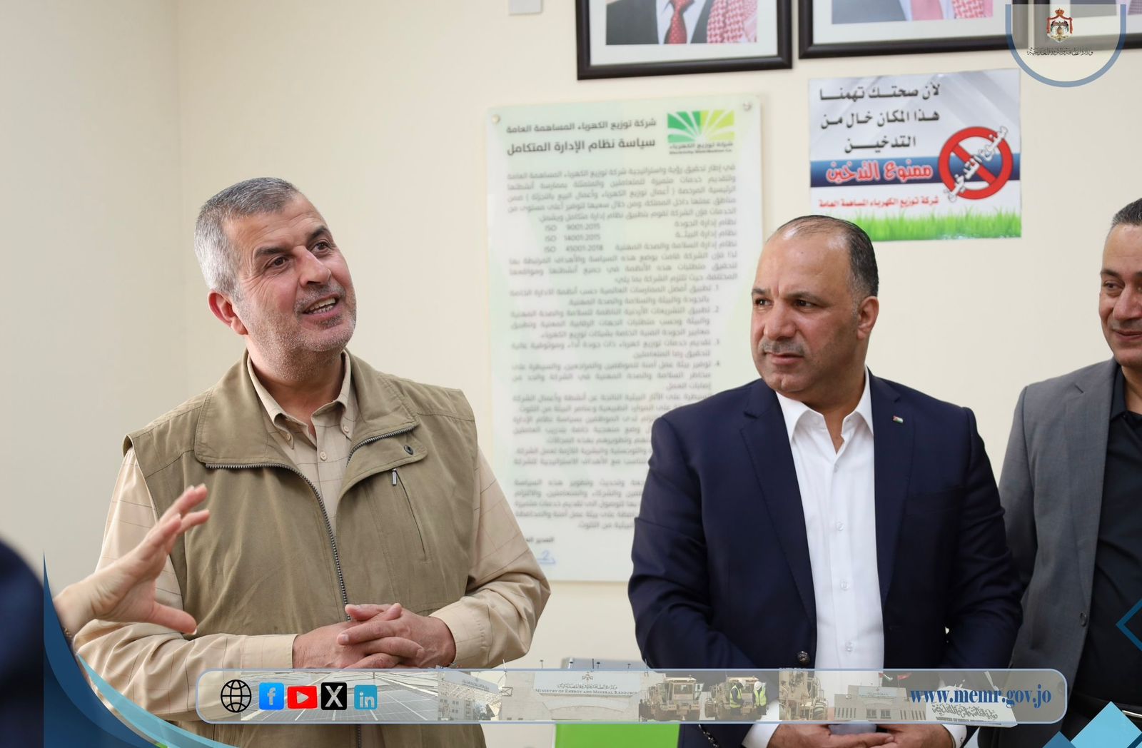 واختتم الوزير جولته بزيارة مكاتب شركة توزيع الكهرباء في الشونة الجنوبية، حيث اطلع على تقدم سير العمل وجهود تحسين جودة الخدمة المقدمة للمشتركين.
