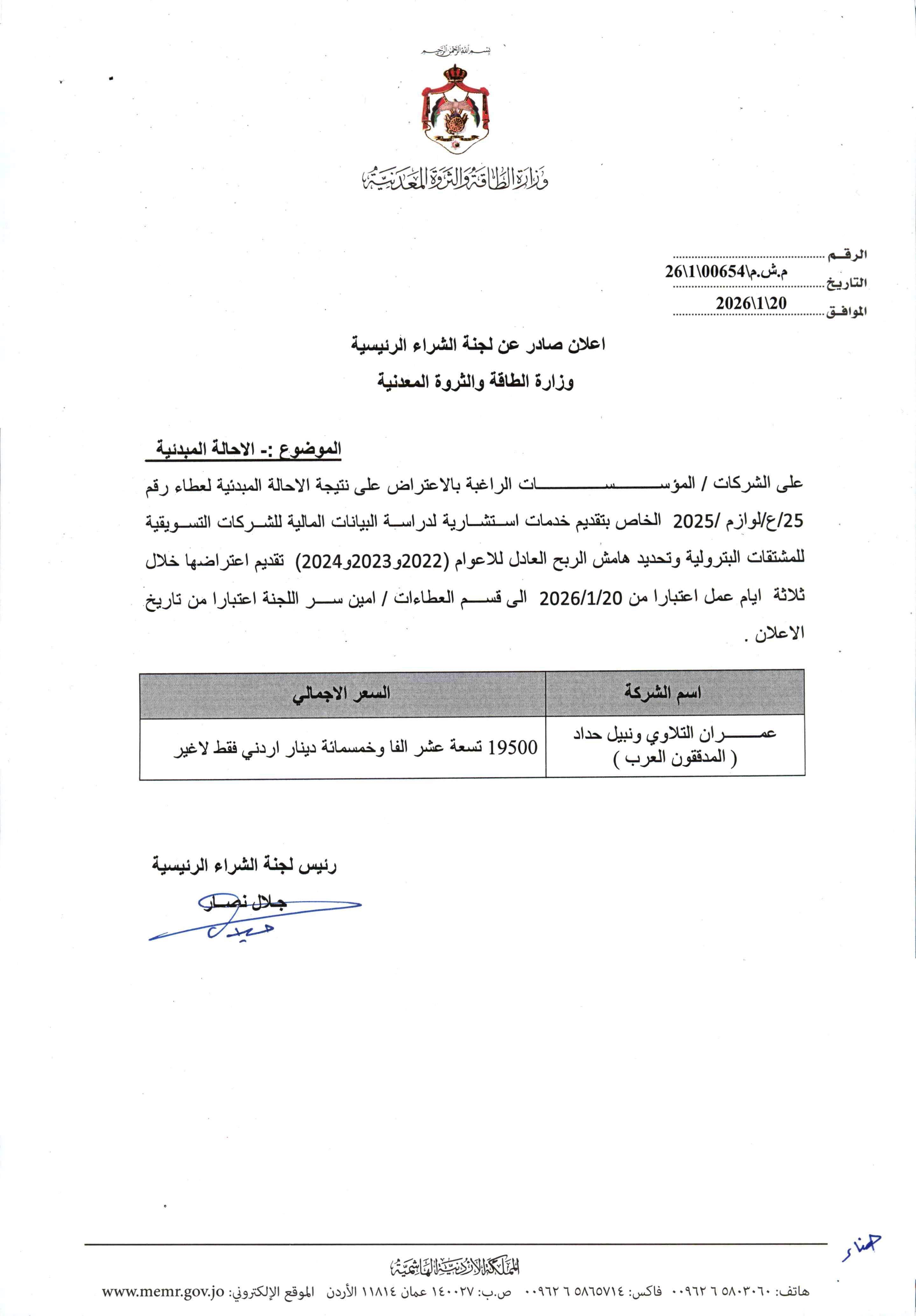اعلان الاحالة المبدئية للعطاء رقم 25/ع/لوازم/2025